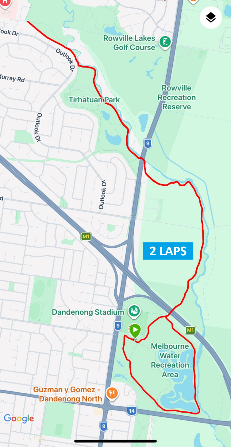 After turning around, runners retrace their steps south along the Dandenong Creek Trail, enjoying a smooth, flowing return back toward the M1 underpass. Once they pass back through the tunnel, the course diverts into the Melbourne Water Recreation Area, where participants complete a scenic loop around the wetlands to finish their remaining kilometres. This beautiful closing section offers open views, wide paths, and a relaxed final run toward the event hub.